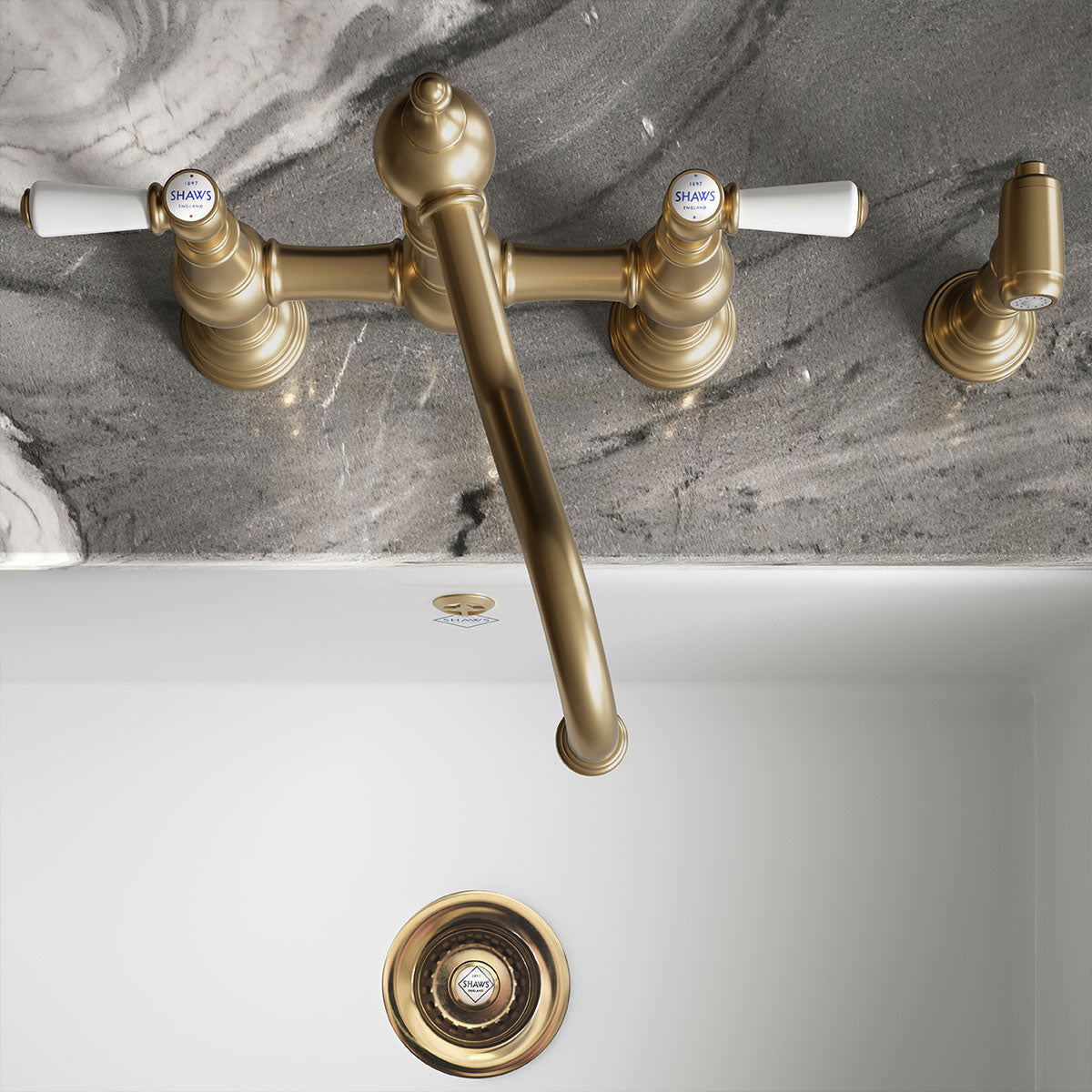 The Shaws by Perrin & Rowe Hambleton Kitchen Mixer with Spray Rinse brings refined French-inspired styling together with practical, everyday function. With its beautifully detailed bridge design, elegant up-swept spout and classic white porcelain lever handles—each finished with the Shaws insignia—the Hambleton adds instant charm and a sense of luxury to any kitchen. Its proportions make it the perfect companion for both single and double bowl fireclay sinks.