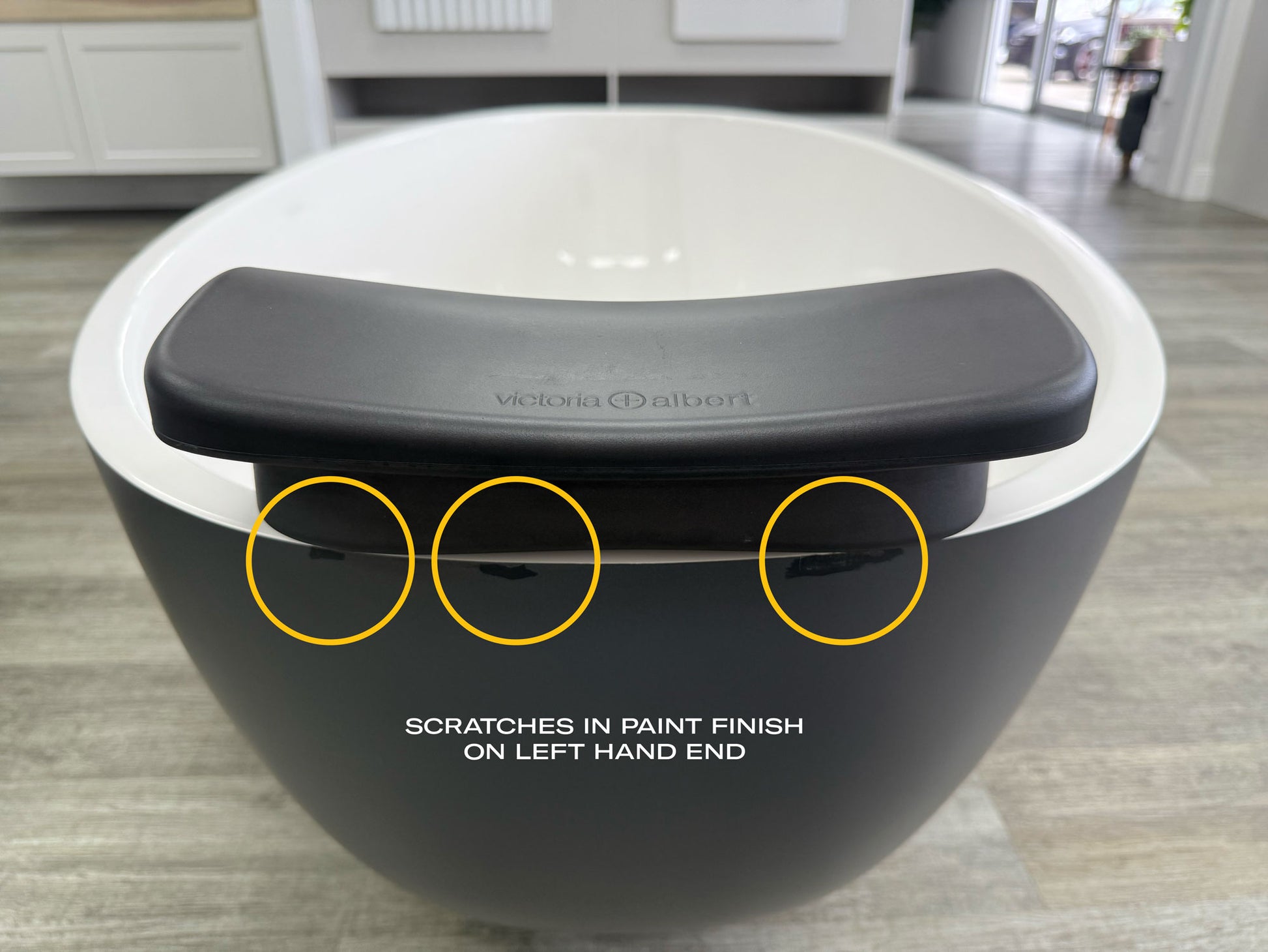 Good condition ex-display model. 3 patches of paint missing on the top left hand edge - not visible from the front of the bath - detailed in photos. Includes bonus Barcelona Backrest in Anthracite finish for a more comfortable bathing experience, while also obscuring the paint damage. Sold as is with no warranty.