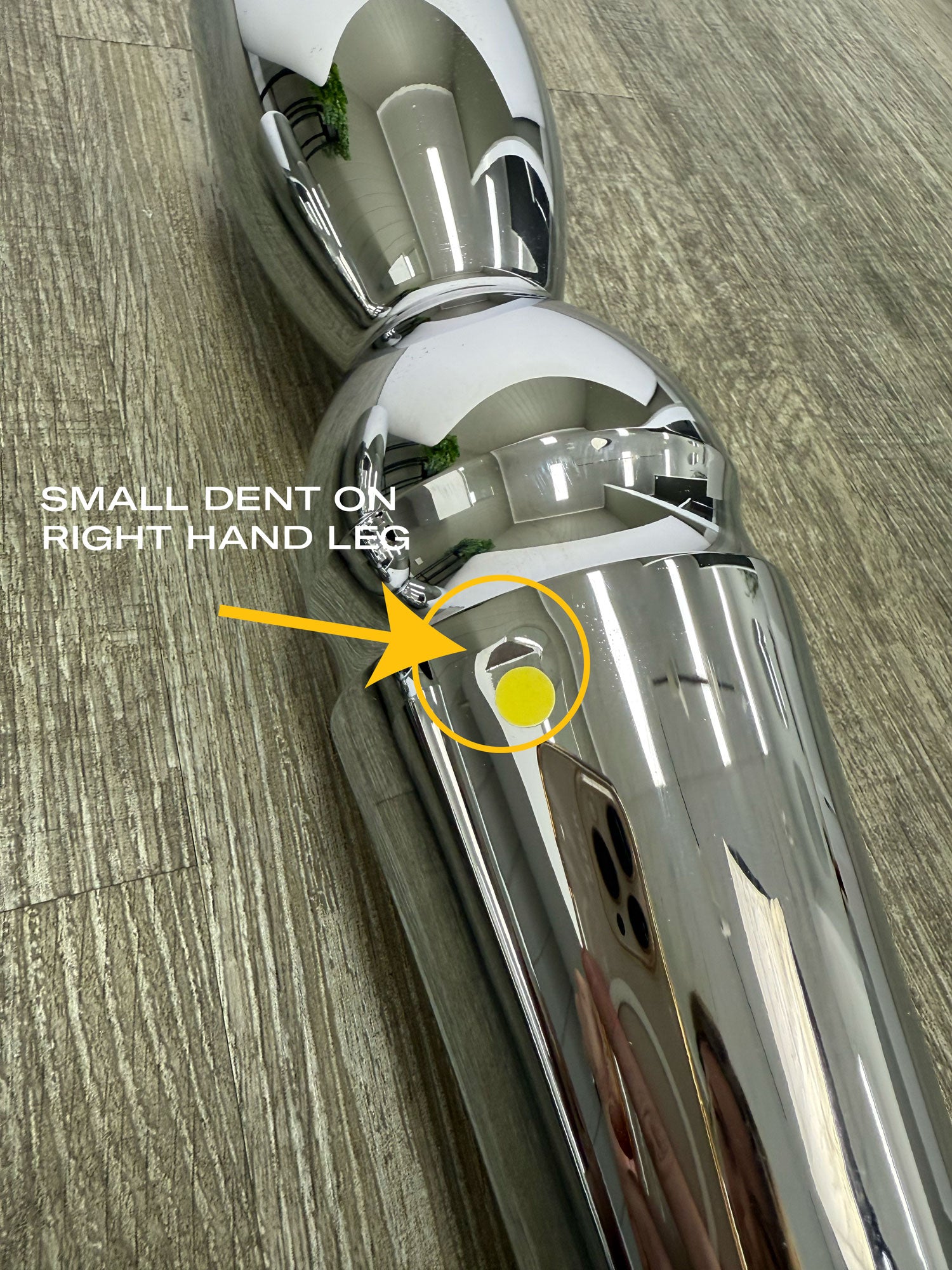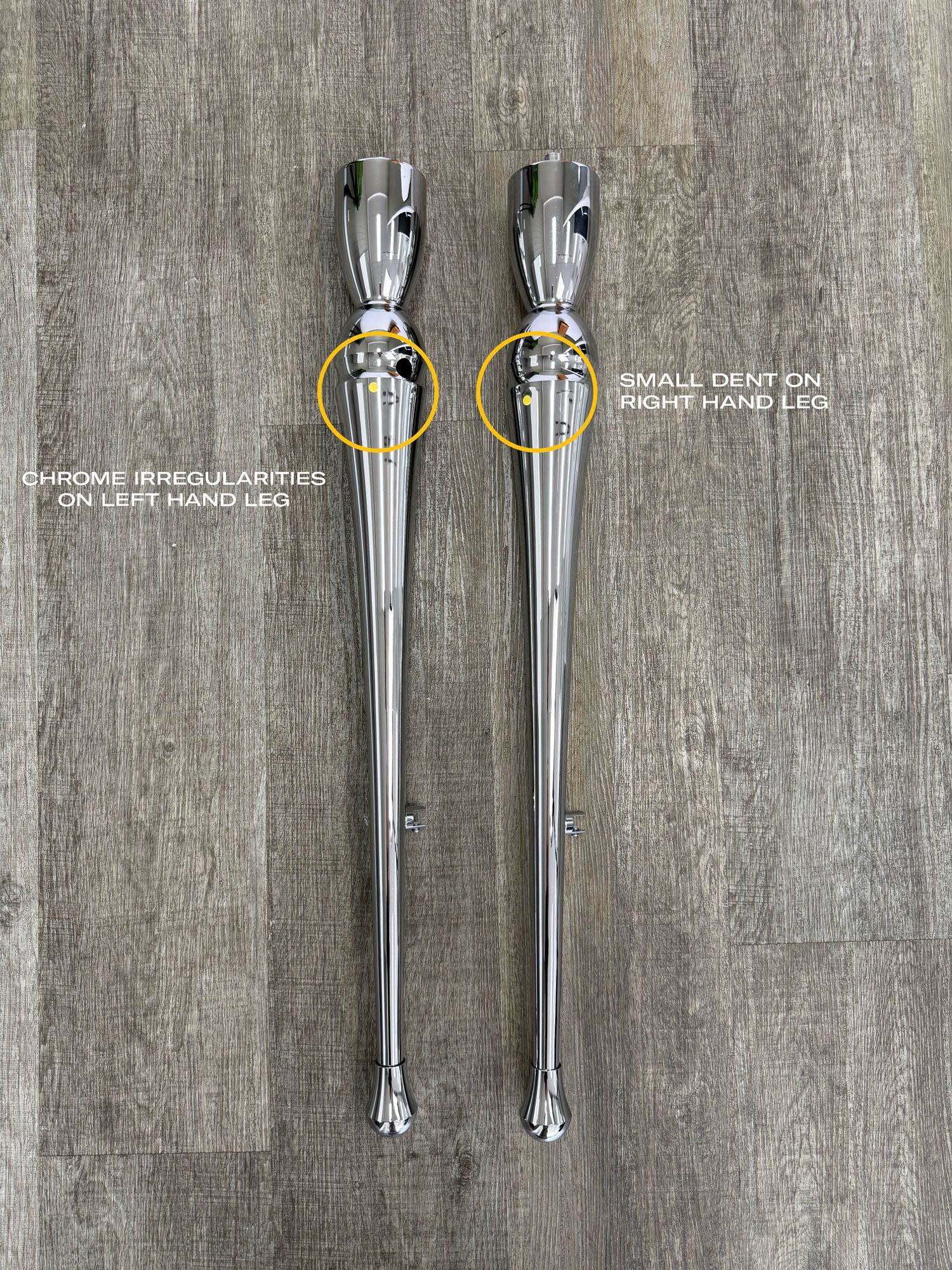 Imperfect model - there is some irregular appearance in the chrome on the left hand leg, which is not noticeable unless up close. The right hand leg has a small dent, positioned on the interior left hand side near the ball joint - also not noticeable unless up close. The price reflects the ex-display condition and is sold as is with no warranty.
