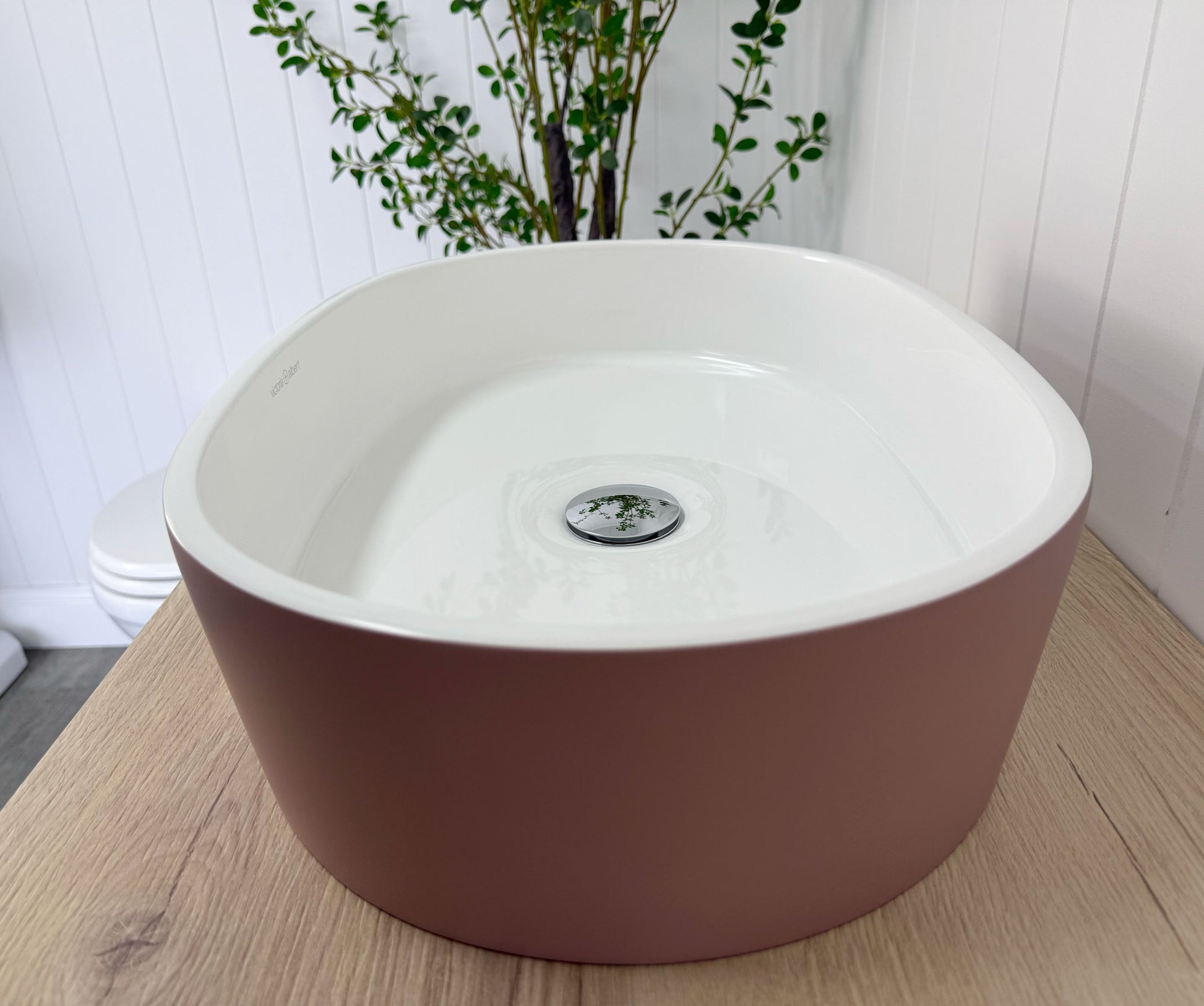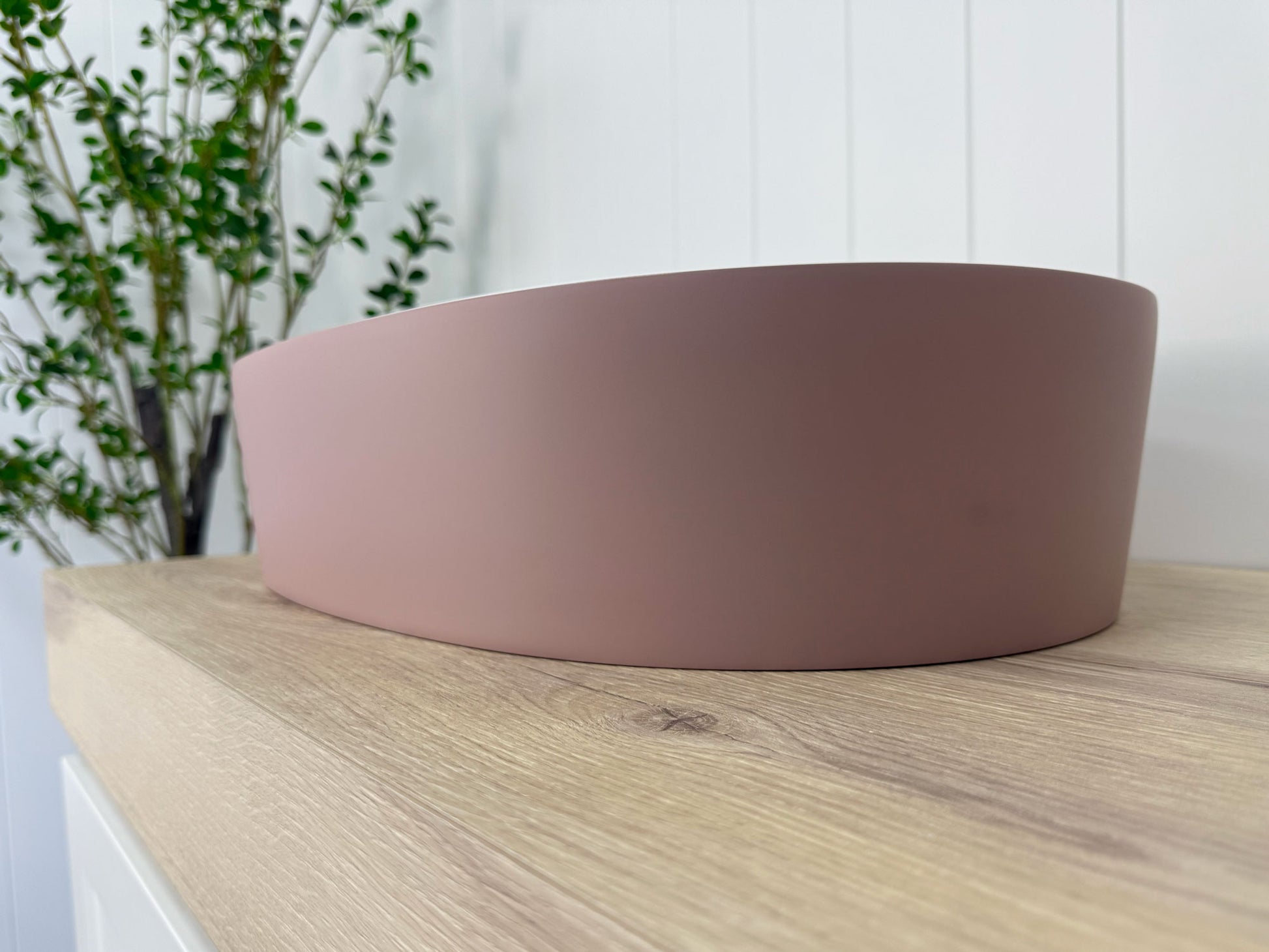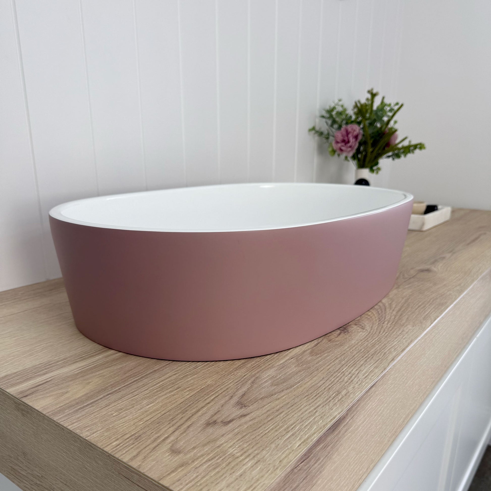 The custom matt pink painted exterior (Dulux 'Attitude' S04C5) adds a striking feature to modern bathrooms.